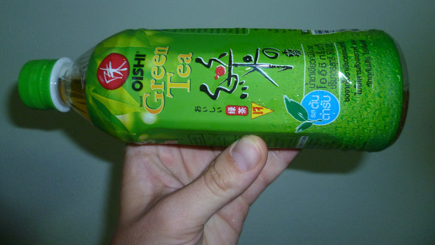 Haha, jag drack en sån där Oishi varannan dag typ under hela tiden i Thailand. Det är grönt jasmine te, med ca 5% tillsatt socker. Dom dominerar kallt-te-på-flaska-marknaden överlägset i Thailand. http://www.oishigroup.com/brand_beverage.php