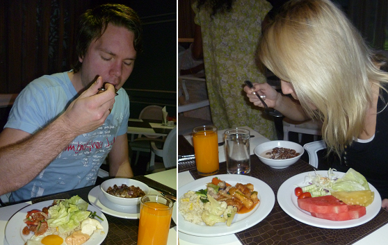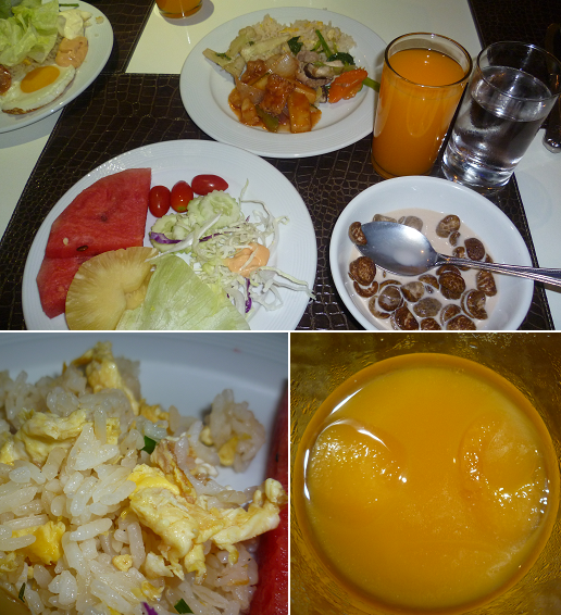 Som ni ser så bestod frukosten inte av sådant man är van vid, varken på Malta eller i Sverige. Eller jo mjölk och flingor fanns ju. Annars var det fried rice, olika kycklingrätter, woker, sallad, vattenmelon, annanas och guaranajuice.